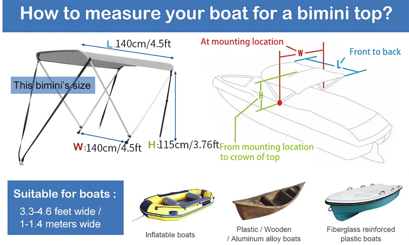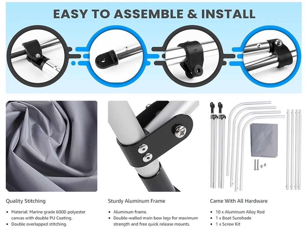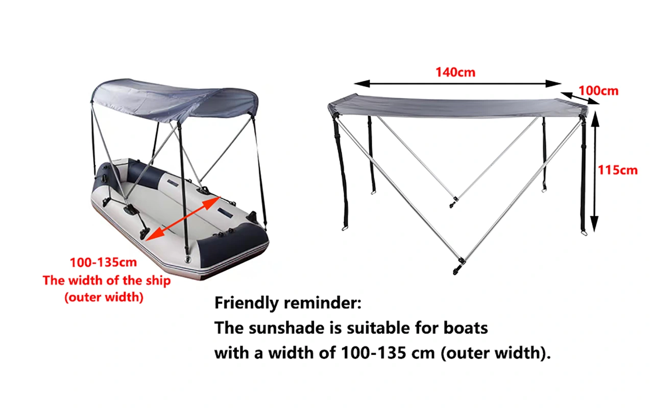 Հովանոց՝ 210D Օքսֆորդի կտորից, խոնավակայուն, անձրևակայուն։ 210D ծովային դասի նյութ Bimini top-ը բազմաֆունկցիոնալ արևապաշտպան հովանոց է ծովի համար, որը կարող է դիմակայել արևի ջերմությանը և պահել ձեզ և ձեր ընտանիքին, որպեսզի կարողանաք վայելել անվտանգ հարմարավետ և անվճար փորձը ծովում: