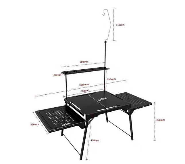 Դյուրակիր ծալովի ալյումինե երկաթե ճամբարային սեղան, ճաշի սեղանի պլատֆորմը բաղկացած է վերին, միջին եւ ստորին մասերից, բավարար տեղով `բոլոր տեսակի սպասք, սնունդ եւ համեմունքներ պահելու համար: