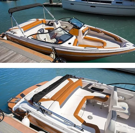 Չժանգոտվող նավակ Bimini վերեւ, պատրաստված ծովային դասարանի 600D պոլիեսթեր կտավով, կրկնակի PU ծածկույթով, մեր պահեստային կոշիկը լավ պաշտպանություն է արեւի լույսից, ծովից, անձրեւից եւ փոշուց: