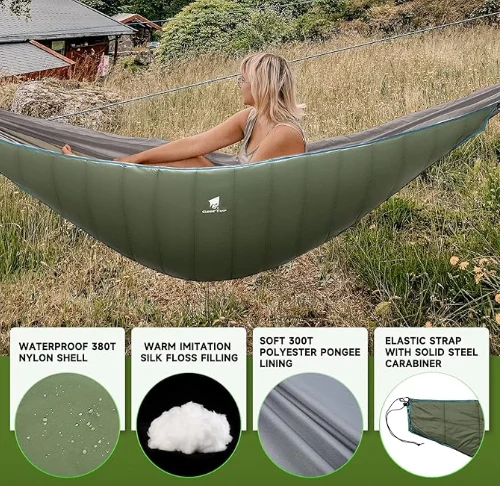 Travel անապարհորդական ճամբարային Hammock- ը Quilt- ի տակ գտնվող ճամբարի համար - 20D 380T անջրանցիկ նեյլոնե կափարիչով պատրաստված գործվածքների կճեպ `փափուկ 300 տ պոլիեսթեր պոնգերի ծածկով; Իմիտացիոն մետաքսե թել լցնում, մաշկ - ընկերական, հարմարավետ